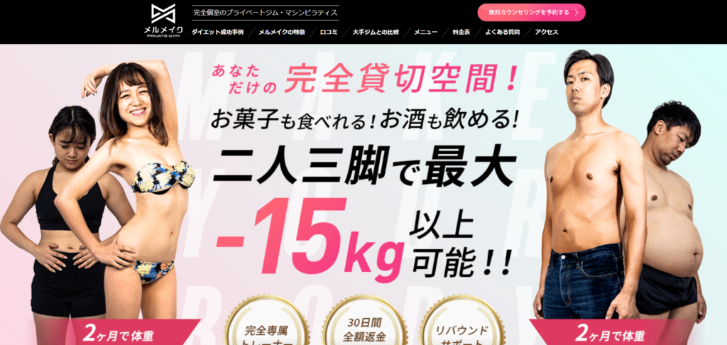 RIZAPは圧倒的な実績と知名度を誇りますが、その分料金も高価格帯です。メルメイクは、RIZAPと同等のサービス(マンツーマン、食事指導、完全個室)を、よりリーズナブルな価格で提供しています。さらに、RIZAPにはない「ピラティス」の要素も加わるため、コストパフォーマンス重視で結果を出したい方にはメルメイクが賢い選択と言えるでしょう。